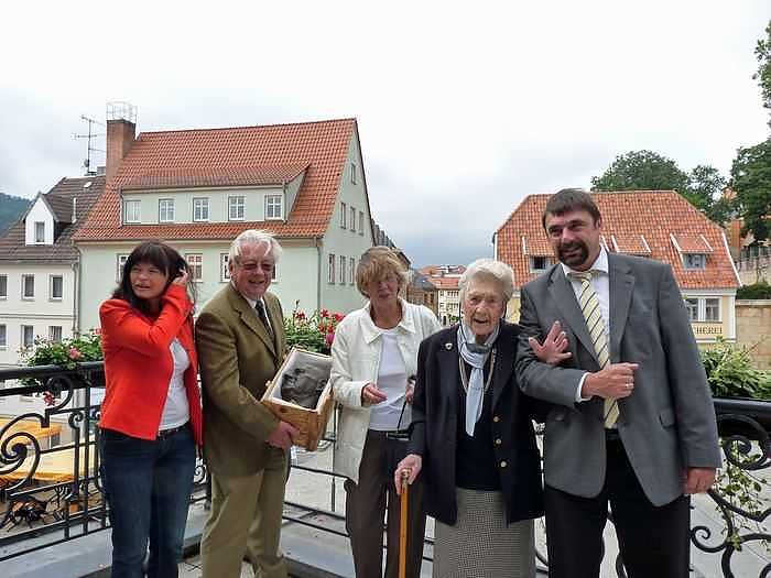 Autor: khhDas relativ schöne Wetter am Vormittag wurde in Sondershausen genutzt, um dem Bürger Joachim Kreyer die Büste zu überreichen. Die Tochter von Kurt Lindner, Charlotte Ottens-Lindner überreichte dem Bürgermeister höchst persönlich die Bronzebüste. Warum das höchst persönlich so betont wurde? Das Geheimnis lüftet sich sehr schnell. Auch wenn man eigentlich das Alter von Damen nicht verrät, in diesem Falle ist es wohl erlaubt. Charlotte Ottens-Lindner wurde 1909 (!) in der Göldnerstraße von Sondershausen geboren.