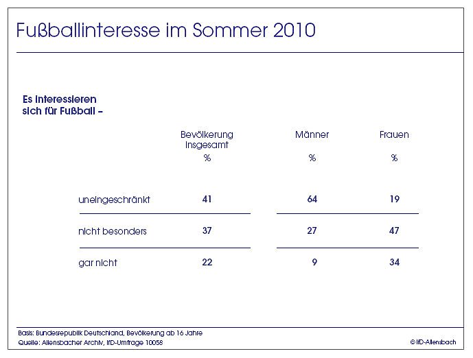 Aktuell interessieren sich 41 Prozent ohne jede Einschränkung für Fußball, 37 Prozent nicht sonderlich und 22 Prozent gar nicht. Damit ist das Fußballinteresse auf hohem Niveau stabil. Während von den Männern rund zwei Drittel zum Kreis der Interessierten gehören (64 Prozent), ist es unter den Frauen nur ein knappes Fünftel (19 Prozent).