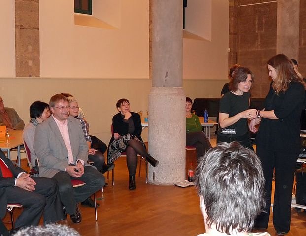 Wer den Marstall betrat, musste erst mal ein Los ziehen. Zu gewinnen gab es nichts, aber die Tische waren mit bunten Schildchen versehen, welches das Schwerpunktthema bei einem so genannten "World-Café" sein sollte, was immer dieses Wortungetüm bedeuten sollte. Aber kn wurde aufgeklärt, denn es war nichts anderes als eine Diskussionsrunde, bei der für den Tisch eine Gesamtredezeit von nur acht Minuten eingeräumt wurde.