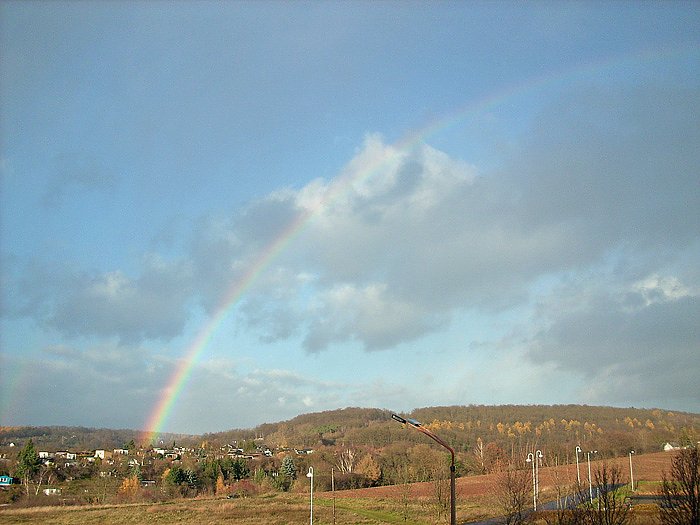 Autor: khhKurz vor 15:00 Uhr schaute noch einem kräftigen Regenguss die Sonne am Himmel heraus und zauberte einen schönen Regenbogen an den Himmel. Schnell Kamera geholt und dokumentiert.