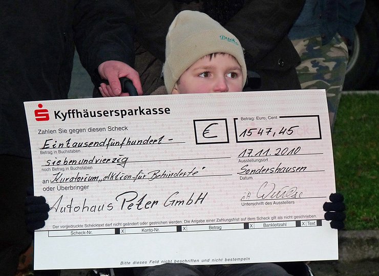 Die Familie Busch mit Enkelsohn Antonio freuten sich, als mit Handschlag von Oberstleutnant Klaus Glaab die Spendensumme von Marko Wuttke (Autohaus Peter GmbH) überreicht wurde. Bei der Übergabe des Spendenschecks dabei die Vertreterin des Kuratoriums