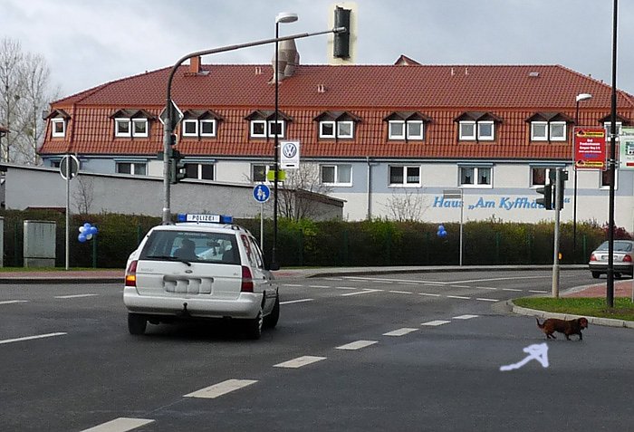 Und wem wurde das doppelte Glück zu teil? Na diesem kleinen Ausreißer, der ohne Begleitung mal so quer über die Kreuzung aus der Bahnhofstraße kommend, in die Klosterstraße wechselte, ohne auf Rot oder Grün zu achten. Von der Benutzung des Gehweges ganz zu schweigen. Einmal Glück hatte der Racker, dass er nicht überfahren wurde, und das zweite Mal Glück, dass er wegen Verkehrsrowdytum nicht gleich von der Ordnungsmacht festgesetzt wurde, weil sie die diesen Schlawiner übersehen hatten, oder einfach mal Gnade vor Recht ergehen ließen.