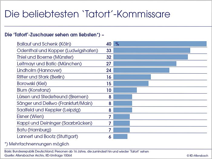 Im Gegensatz zu anderen Krimi-Reihen sind im 'Tatort' nicht in jeder Folge dieselben Kommissare zu sehen, sondern es kommen verschiedene Ermittlerteams aus allen Teilen Deutschlands zum Einsatz. Die Zuschauer haben dabei klare Favoriten: Die Kölner Kommissare Ballauf und Schenk werden von 40 Prozent der 'Tatort'-Zuschauer besonders gerne gesehen, jeder Dritte zählt das Ludwigshafener Ermittlerteam um Lena Odenthal und Mario Kopper zu seinen Favoriten. Auf den Plätzen drei und vier folgen Thiel und Boerne aus Münster sowie Batic und Leitmayr aus München. Der spezielle Humor von Thiel und Boerne findet seine Anhänger dabei allerdings vor allem bei Leuten mit höherer Schulbildung.