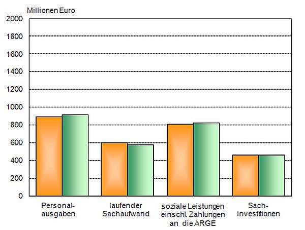 Angewachsen sind ebenfalls die Ausgaben für soziale Leistungen. Insgesamt wurden 825,1 Millionen Euro ausgegeben, ein Anstieg von 17,1 Millionen Euro. Hier sind u.a. die Ausgaben für Sozialhilfe (+ 15,5 Millionen Euro) und für die Jugendhilfe (+ 4,2 Millionen Euro) angestiegen. Dagegen sind in den ersten neun Monaten 2010 die Leistungen im Rahmen von Hartz IV (einschließlich der aufgabenbezogenen Leistungsbeteiligung) um 8,2 Millionen Euro auf insgesamt 324,6 Millionen Euro gesunken.