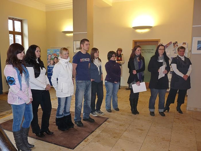 Ein Teil der 11 Schülerinnnen und Schüler zusammen mit ihrer stellvertretenden Schullieterin Kathrin Bärwinkel. Von ursprünglich 19 gestarteten Jugendlichen setzen noch 11 die Ausbildung fort.