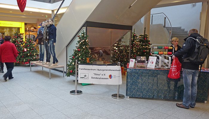Wo früher das italienische Eiscafé war, stehen jetzt ein paar Kleiderpuppen und der Verein Düne e.V. kann seinen Einpackservice anbieten. Unklart ist noch was da los ist, denn wegen Krankheit ist sicher nicht geschlossen.