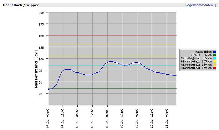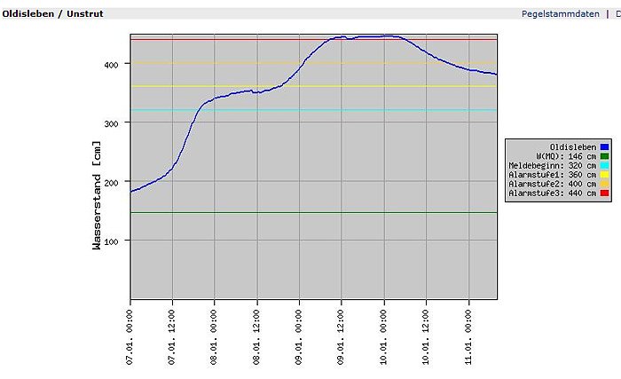 Im Bereich der Wipper, einem wichtigen Zufluss der Unstrut zieht bald wider Normalität ein. Hier ist der Pegel schon soweit gesunken, dass er unterhalb der Meldegrenze liegt, und auch nicht mehr weit von der Normalhöhe ist.
