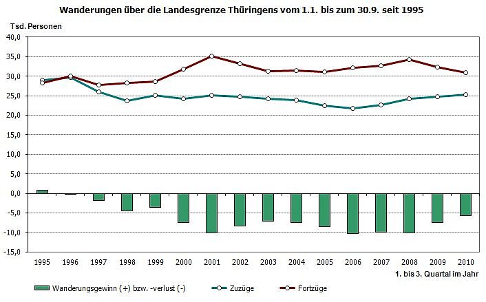 In den ersten drei Quartalen 2010 standen den 25 193 Zuzügen nach Thüringen 30 922 Fortzüge über die Landesgrenzen gegenüber. Von Januar bis September 2009 waren es 24 779 Zuzüge und 32 275 Fortzüge. Damit ist der Rückgang des Wanderungsverlustes sowohl auf einen leichten Zuwachs der Zuzüge nach Thüringen als auch auf weniger Fortzüge zurückzuführen.