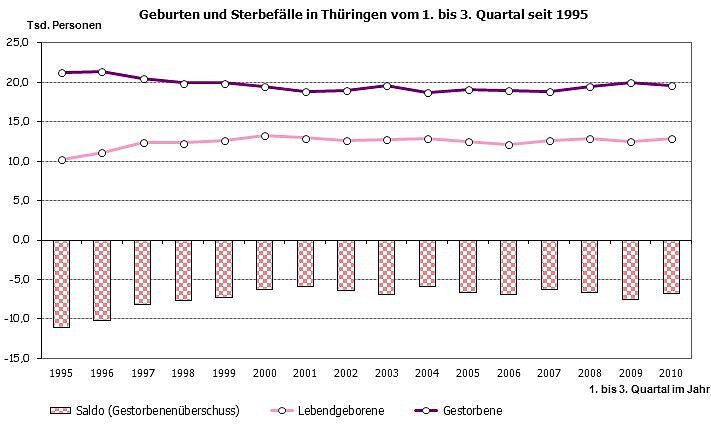 In den ersten neun Monaten 2010 gab es 12 903 Lebendgeborene sowie 19 658 Sterbefälle. Da einerseits 372 Thüringer Babys mehr zur Welt kamen und 360 Personen weniger starben, fiel der Gestorbenenüberschuss um 732 Personen geringer aus als im gleichen Zeitraum 2009.