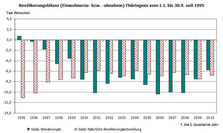 Der Einwohnerrückgang von Januar bis September 2010 resultierte aus einem Wanderungsverlust von 5.700 Personen sowie einem Sterbefallüberschuss von fast 6.800 Personen. In den ersten neun Monaten 2009 betrugen der Wanderungsverlust und der Sterbefallüberschuss noch jeweils 7.500 Personen. Täglich 'verlor' Thüringen in den ersten drei Quartalen 2010 durchschnittlich 46 Einwohner, darunter 24 Frauen. Dem Wanderungsverlust sind dabei 21 Personen (11 Männer und 10 Frauen) zuzuschreiben.