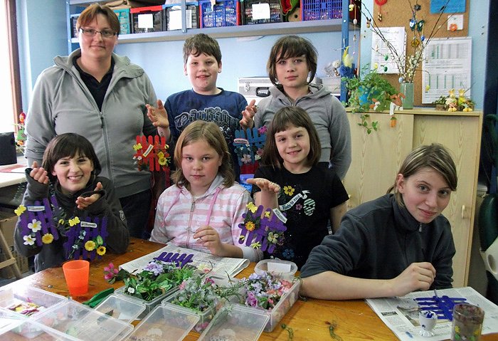 Da konnten viele kleine Bastelmeister schon Frühlingskränze aus Birke und eine Zaunbild im Frühlingslook bunt gestalten. Vor Ostern werden zur Dekoration Holzosterhasen und Plasteostereier für den Osterstrauß marmoriert. Auch in den Ferien findet ein tolles Angebot für alle daheimgebliebenen Kids statt.