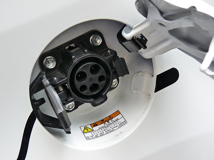 Und so sieht einer der beiden E-Anschlüsse aus. Mit einer vollen Batterieladung kommt man 160 km weit und bekommt eine Spitzengeschwindigkeit von 130 km/h drauf. Eine Batterieladung dauert rund sieben Stunden, eine Schnellladung eine halbe Stunde. Gerade diese Schnellladungen können in Zukunft das Problem sein, weil in kurzer zeit viel Strom gezogen wird. Wenn das mehrere Leute im engen Umkreis machen, könnten schon mal in der Verteilerstation der Straße oder des Ortes die Sicherungen rausspringen. Hier wird man eben die im Bericht 1 erwähnten intelligenten Netze brauchen (E-Mobilität).