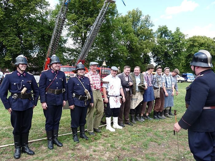 Und was nicht alles geboten wurde. Mit viel schauspielerischen Talent agierten die Kameraden der Feuerwehr Urbach, die aus dem benachbarten Kreis Nordhausen kamen. Sie spielten mal mit viel Ironie vor, wie sich "früher" vielleicht mal so ein Löschangriff gestaltet haben mag. Da ging es noch mit der Handpumpe los.