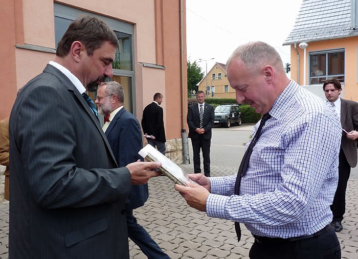 Der Geschäftsführer der Stadtwerke Sondershausen, Wilhelm Schreier, konnte im E-Werk neben dem Innenminister noch zahlreiche Gäste begrüßen, so unter anderem Bundestagsmitglied Johannes Selle (CDU) und die Landtagsmitglieder Dorothea Marx (SPD) und den mit einer Halskrause gehandicapten Landtagsmitglied Manfred Scherer (CDU), der Vorgänger des Thüringer Innenministers. Aber auch der Kommandeur des Sondershäuser Bundeswehrstandortes, Oberstleutnant Klaus Glaab war dabei, sind doch die Stadtwerke ein wichtiger und solider Lieferant von Fernwärme für die Kaserne.