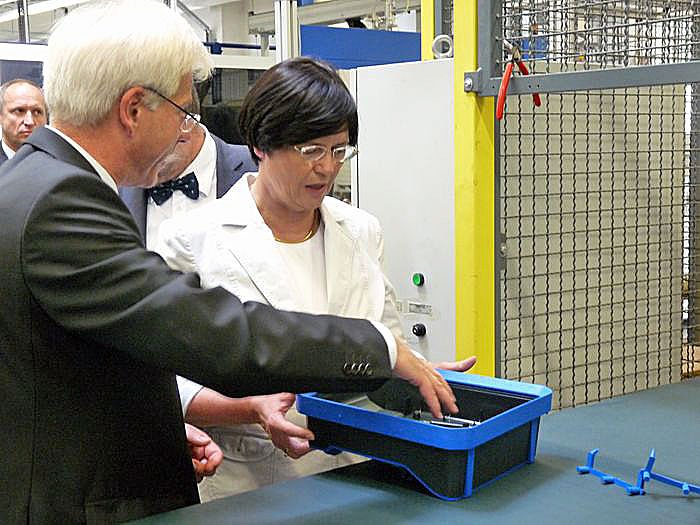 Sonlux fertigt seine Produktpalette natürlich überwiegend auf automatisierten Produktionslinien. Dabei werden Duro- und Thermoplaste als Schwerpunktmaterialien eingesetzt. Weiterhin beherrscht das Unternehmen technologisch modernste Verfahren wie die Zwei-Komponenten-Technik und das Vakuum-Tiefziehverfahren. Davon konnte sich die Ministerpräsidentin bei ihrem Rundgang mit Geschäftsführer Reiner Jürgens (Bild) überzeugen.