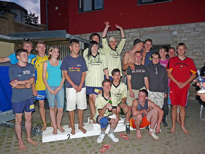 Am Abend stand neben einem gemütlichen Beisammensein im JUST des Kreisjugendrings ein kleines Volleyballturnier auf dem Programm. Carlos Ziedan übergibt den Siegerpokal an die Spielführerin des JUST. Neben der Mannschaft vom JUST traten zwei Mannschaften aus dem Jugendbewegungsteam, ein Team vom Stadtjugendring und das Team Red Devil an. Einige Mitglieder der Teams Stadtjugendring und Red Devil waren am Abend dann recht "platt", da man von 10 bis 16 Uhr schon beim Allroundturnier in der Borntalarena teilgenommen hatte.