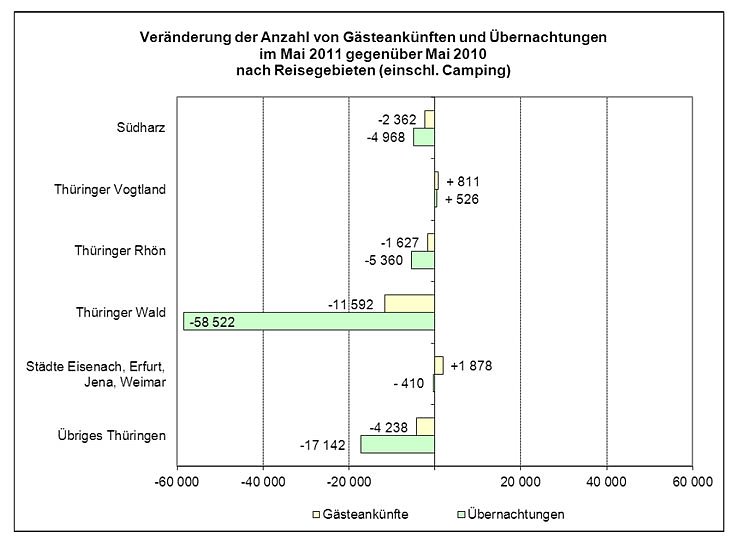 Der Rückgang der Übernachtungszahlen resultierte im Mai 2011 hauptsächlich daraus, dass im Thüringer Wald die Ergebnisse im Vergleich zum Vorjahresmonat deutlich zurückgingen. So sank die Zahl der Übernachtungen in diesem Reisegebiet um 59.000 (-13,8 Prozent). Die Zahl der Gästeankünfte ging im gleichen Zeitraum um fast 12.000 zurück (-8,2 Prozent). Ebenso hatten die Reisegebiete Südharz und Thüringer Rhön hohe Rückgänge der Gäste- und Übernachtungszahlen zu verbuchen.