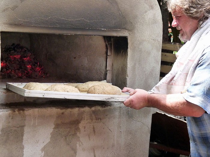 Dann war Karli an der Reihe. Die bereits vorgerührten und dann geformten Brote wurden von ihm in den Ofen geschoben.