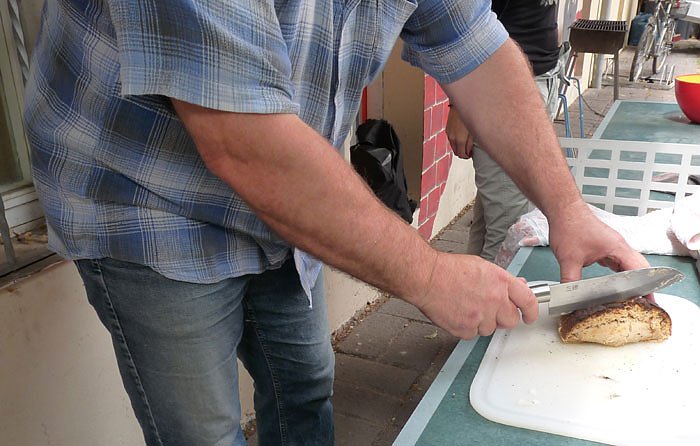 Das Warten hat ein Ende. Das fertige Brot wird von Karli schon mal angeschnitten. Wie es geschmeckt hat? Leider keine Ahnung. Den Anschnitt hat kn noch mitbekommen und schon ging es zum nächsten Termin. Knusprig sah es aber aus.