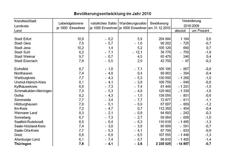 Auf ein fast ausgeglichenes natürliches Saldo konnten im letzten Jahr Erfurt (-46 Personen) und Wei-mar (-45 Personen) bei gleichzeitigem Wanderungsgewinn (Erfurt: +1 201 Personen, Weimar: +291 Personen) verweisen. Bezogen auf die Gesamteinwohnerzahl kamen in Jena, Erfurt, Weimar und im Eichsfeld die meisten Kinder zur Welt - die wenigsten im Altenburger Land und in Suhl. Dabei kann Suhl im Jahr 2010 auf die höchste Steigerung in der Geburtenrate (+ 27 Prozent) gegenüber dem Jahr zuvor im Vergleich zu allen anderen Kreisen verweisen.
