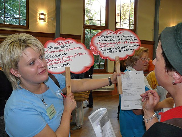 Ein bis zwei Stunden dreht sich alles darum, Kontakte zu knüpfen und Ideen zu entwickeln, wie man sich gegenseitig mit seinen eigenen Ressourcen unterstützen kann. Dabei können sowohl Sachmittel und Know-how als auch tatkräftige Hilfe zum Gegenstand einer Engagementvereinbarung werden. Nur eine Sache darf an diesem Abend nicht verhandelt werden - Geld! Das Ende der Handelszeit wird wieder durch einen Gongschlag verkündet. Wer möchte, kann den Abend bei einem kleinen Imbiss und einem interessanten Gespräch ausklingen lassen.