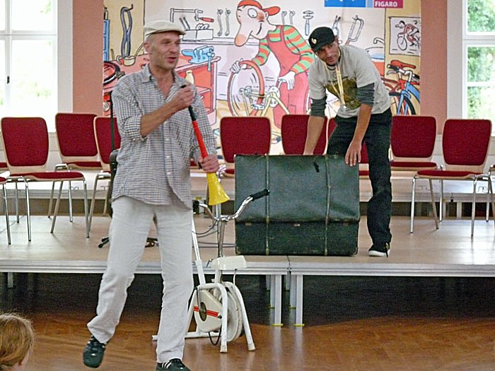 Gemeinsam singen mit Figarino hieß es im Achteckhaus dann für die Besucher. Figarino zeigten wie man auf Fahrradersatzteilen musizieren kann und regten die Besucher zum gemeinsamen Singen ein. Den Gesang begleitet er auf seiner Gitarre. Kinder konnten mit Trommeln und Triangeln mitmischen.